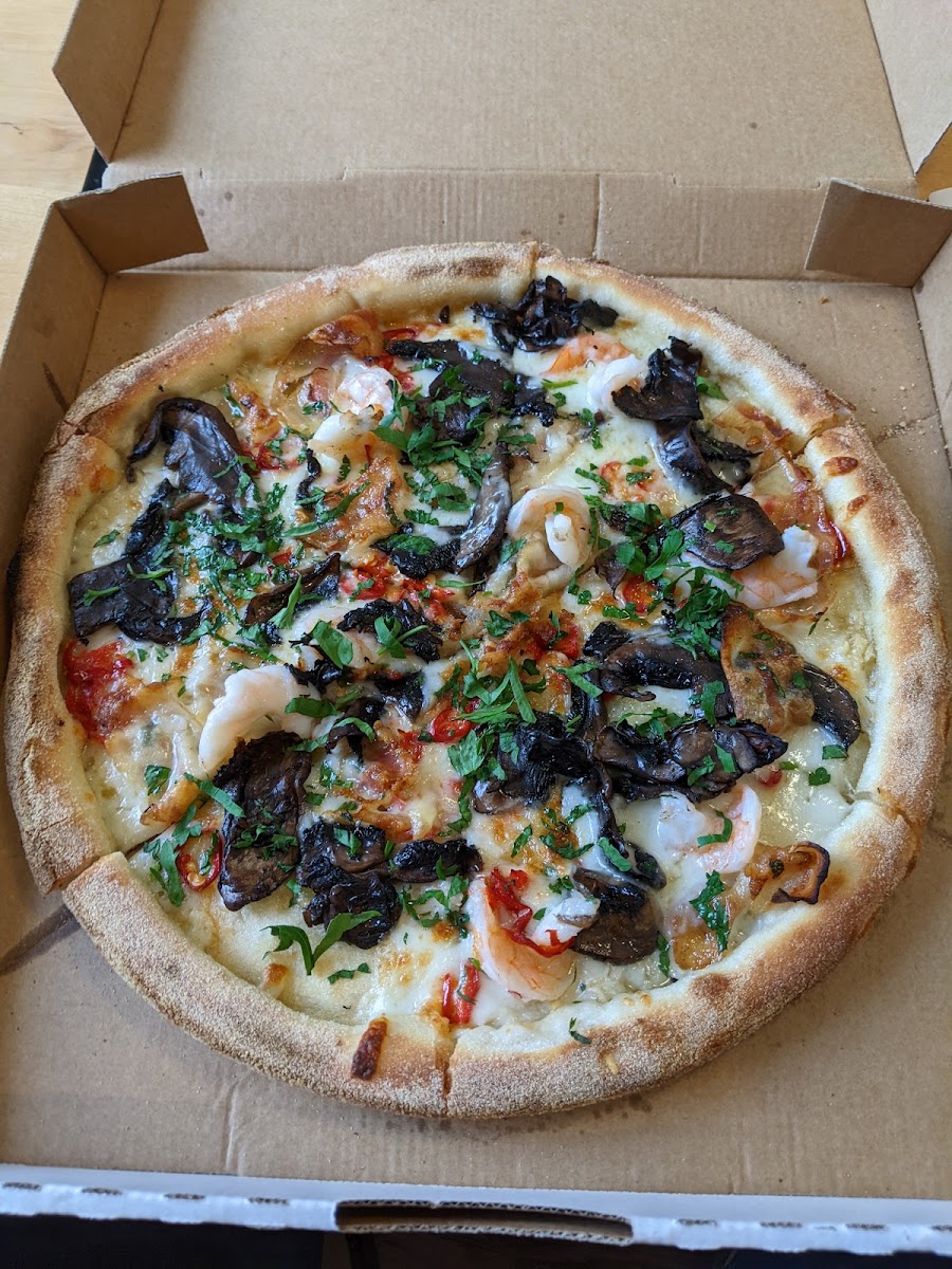 Very tasty takeaway pizza. Called ahead and was done when I got there less than 15 minutes later. If you live close enough it's a lot cheaper than delivery. (surf n turf with added mushrooms). Recommended pizza's are those with mushrooms & truffle oil, and the potato pizza.