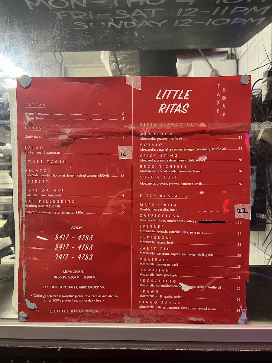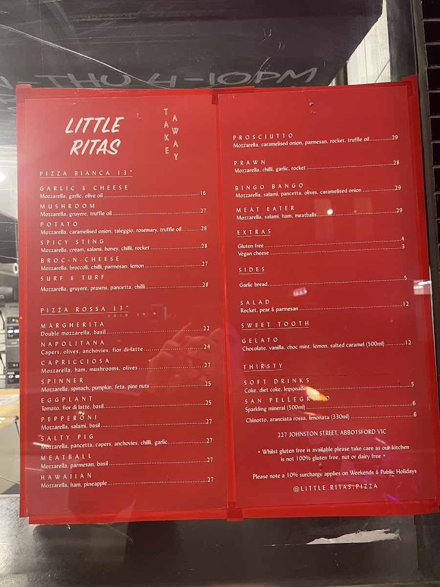 Welcome to Little Rita's, a delightful pizza takeaway nestled in Abbotsford, VIC. Their menu boasts a range of tantalizing 13-inch pizzas, including the savory Prosciutto Pizza topped with caramelised onion and truffle oil, and the spicy Prawn Pizza infused with garlic and chili. At Little Rita's, every bite speaks of quality, from the chewy crust to the fresh, generous toppings.
